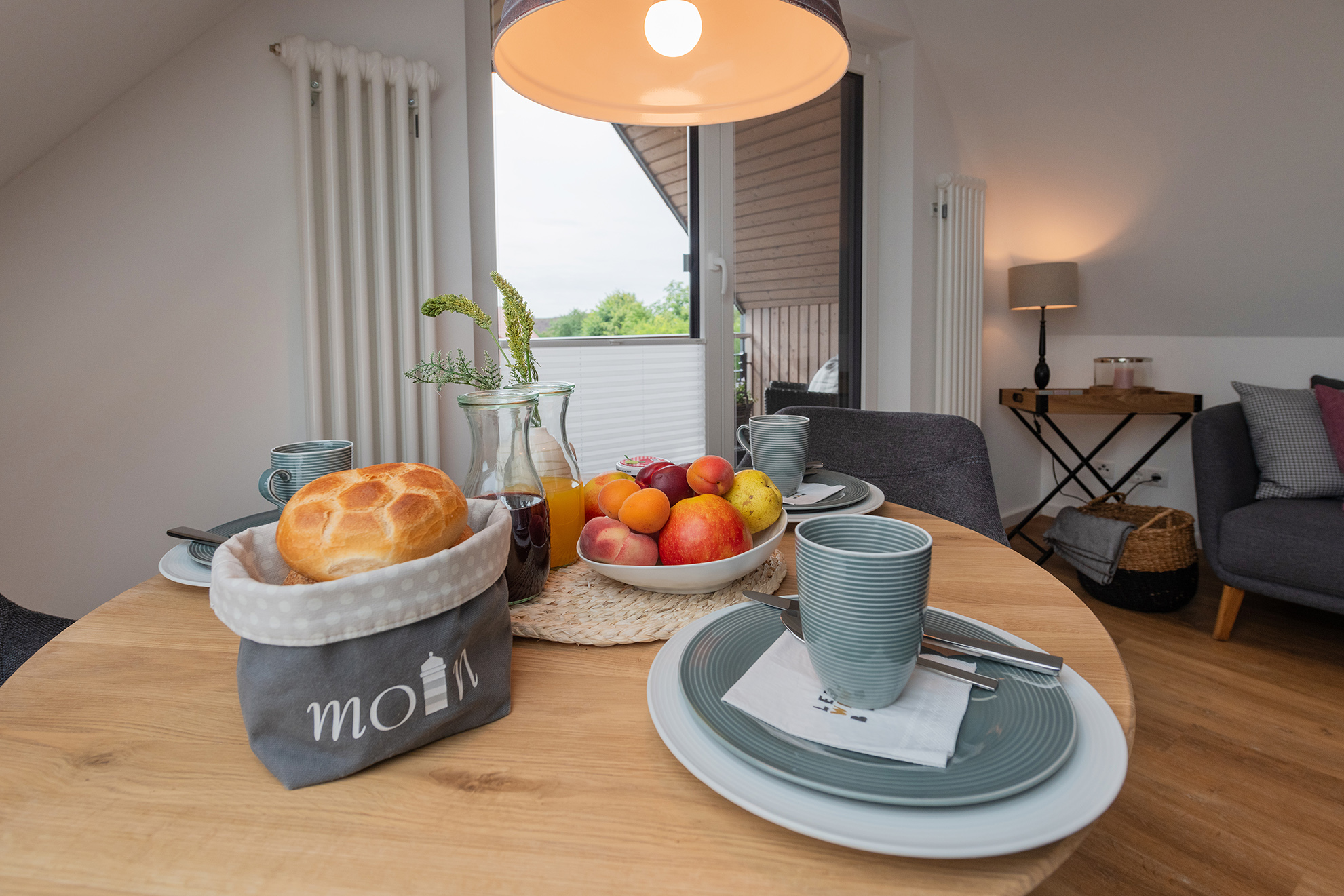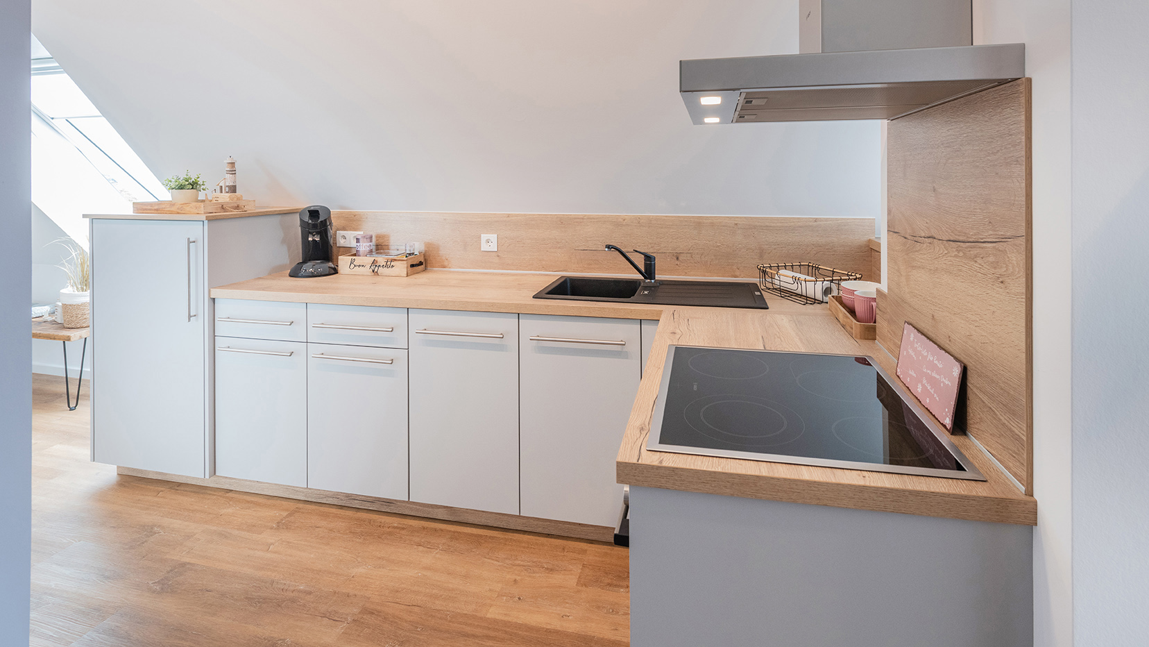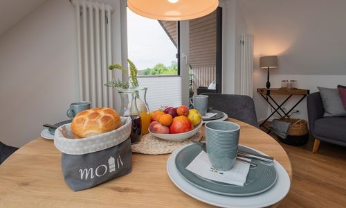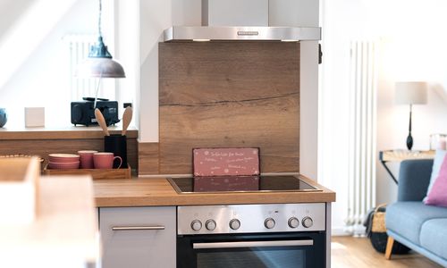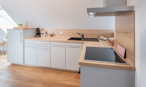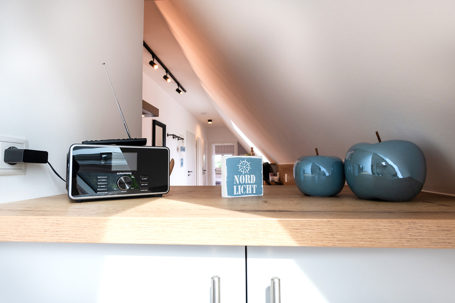 Die neu eröffnete Wohnung "Nordlicht" ist im skandinavisch-maritimen Stil hell, modern und ansprechend eingerichtet. Hier fühlt man sich einfach wohl. Die komplett ausgestattete Küche verfügt neben einem Backofen zusätzlich über eine Spülmaschine.