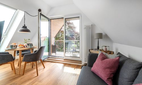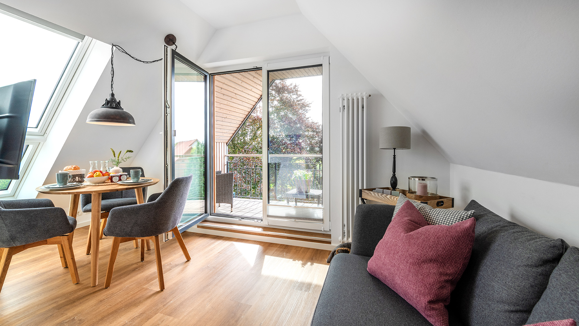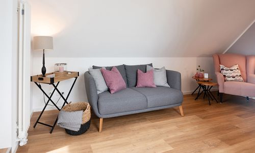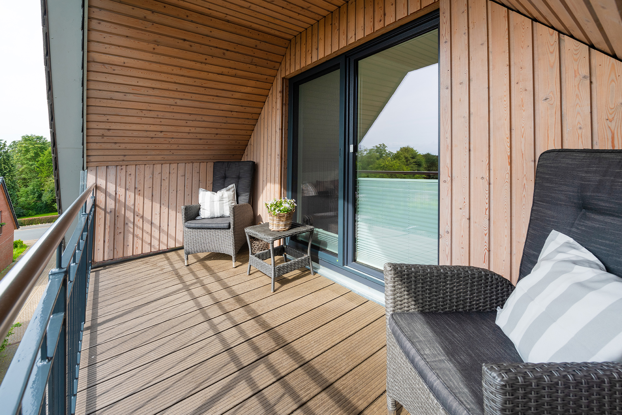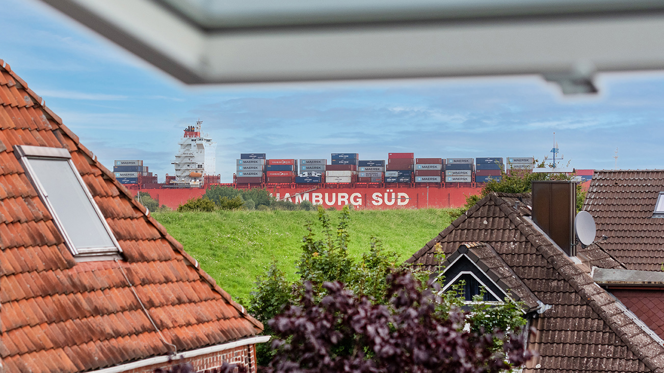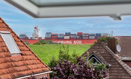 Die Dachwohnung befindet sich im 2. Obergeschoss und verfügt über eine große Loggia mit Blick auf den Garten und die Apfelplantagen im Alten Land. Von der Loggia und den Fenstern aus können Sie die großen Schiffe verfolgen, die nach Hamburg oder Richtung Nordsee fahren. Der Ausblick ist wirklich einzigartig!