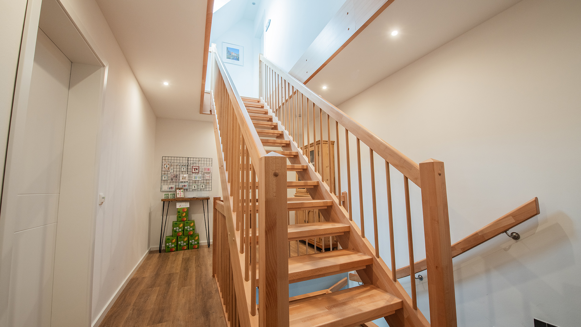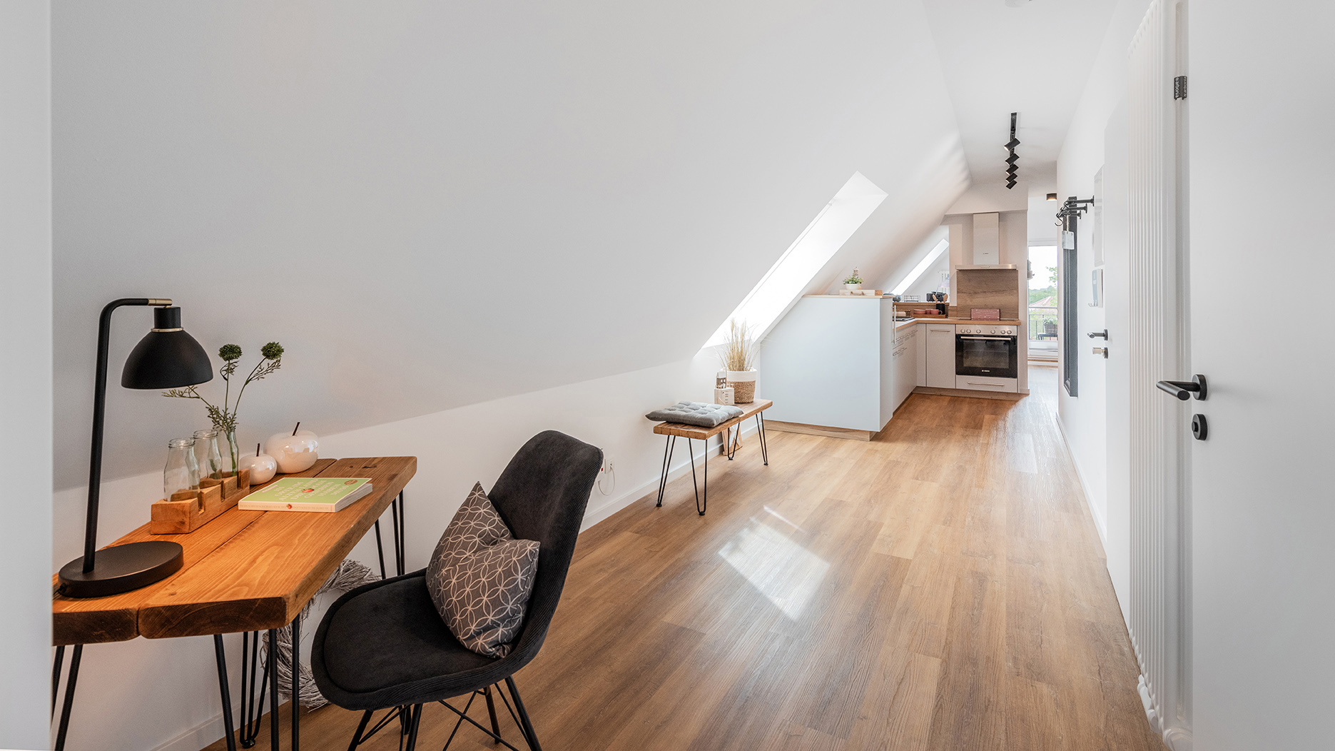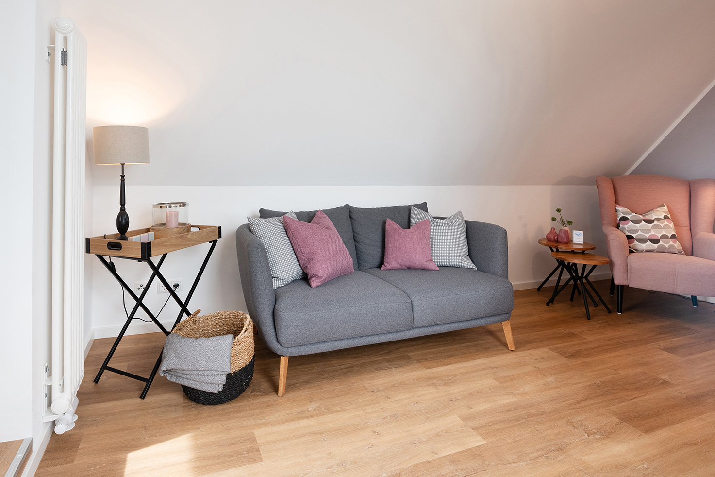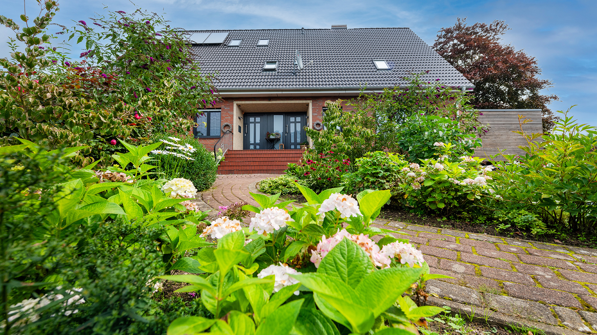 Die Dachwohnung befindet sich im 2. Obergeschoss und verfügt über eine große Loggia mit Blick auf den Garten und die Apfelplantagen im Alten Land. Von der Loggia und den Fenstern aus können Sie die großen Schiffe verfolgen, die nach Hamburg oder Richtung Nordsee fahren. Der Ausblick ist wirklich einzigartig!